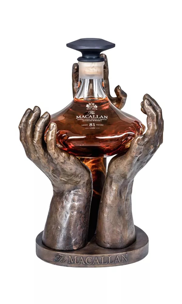The whisky is housed in a mouth-blown decanter, held by a bronze sculpture of three hands — representing the past, present, and future of The Macallan. The cabinet is crafted from elm wood felled on The Macallan Estate in 1940, the year of distillation. Only 288 bottles were released worldwide, making it one of the most collectible Scotch whiskies ever made.